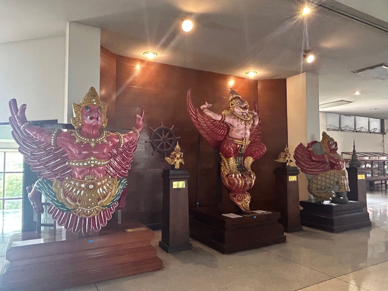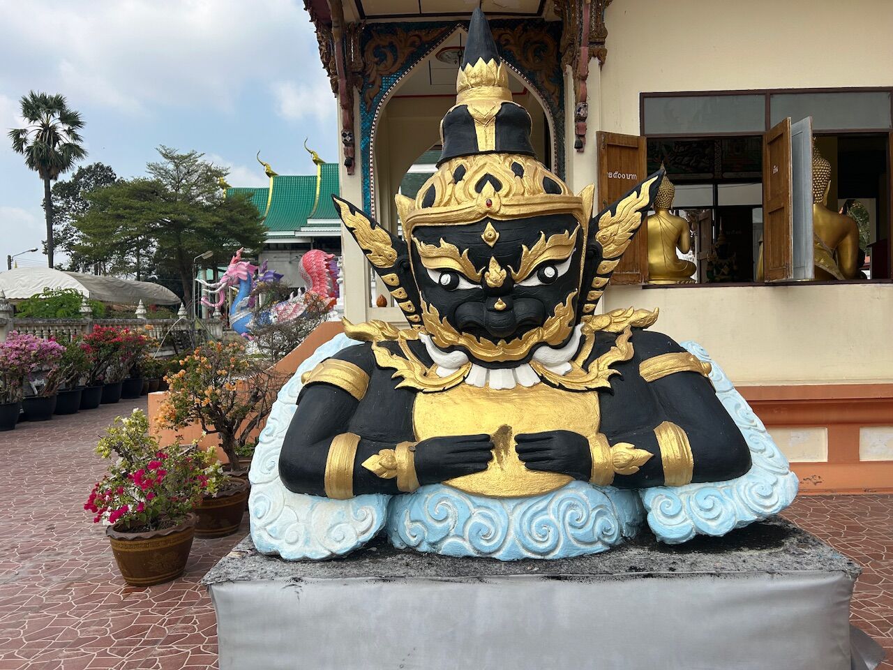 これはお寺でよく見かけるプララーフ像だと思うのですが、なんかかわいいんです。確かプララーフは、実はヒンドゥー教の伝説では悪魔だそうです。神々と悪魔が不老不死の薬(アムリタ)を取り合ったとき、こっそり盗み飲みした悪魔こそがラーフでした。そして、月と太陽の神様がヴィシュヌ神(ヒンドゥー教の最高神である三大神の一つ)にそのことを告げ口したため、体を真っ二つにされてしまいます。しかしアムリタを少し飲んでいたので上半身だけ不死となっていて、4本の腕と蛇の尾を持つ今の姿になりました。