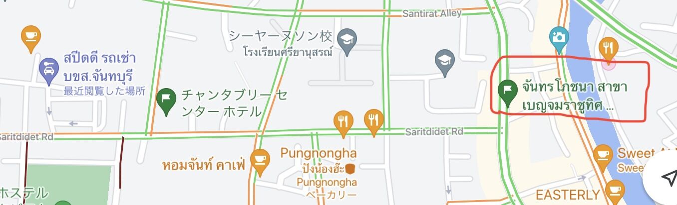 ちょっと友人が写りこんでいますが、これで広さがわかります 荷物を置いてまず食事へ。ホテルの人が教えてくれたのは、チャントーンポーチャナーというお店。Googleのクチコミも多く高評価だった。