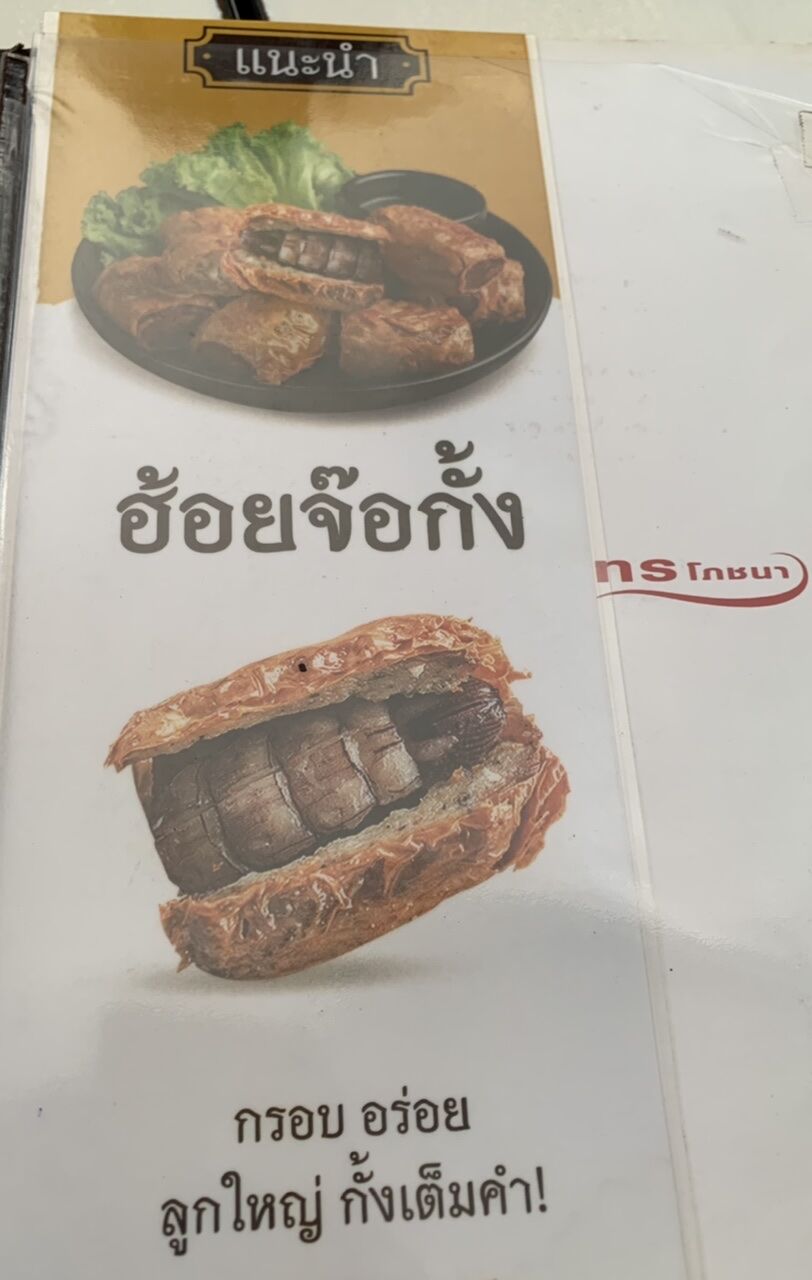 この写真だけでは、一体何なのかがわからない。春巻きのような感じもするが、中に何が入っているのだろう。店員さんに聞くと「ก้ัง」。だめだ、私の語彙にはない。ということであわててスマホの辞書で調べると、「シャコエビ」だった。下の写真を見て、一瞬シャコエビに似ているなとは思ったのだが。これはシャコエビを湯葉で巻いて揚げたものだった。