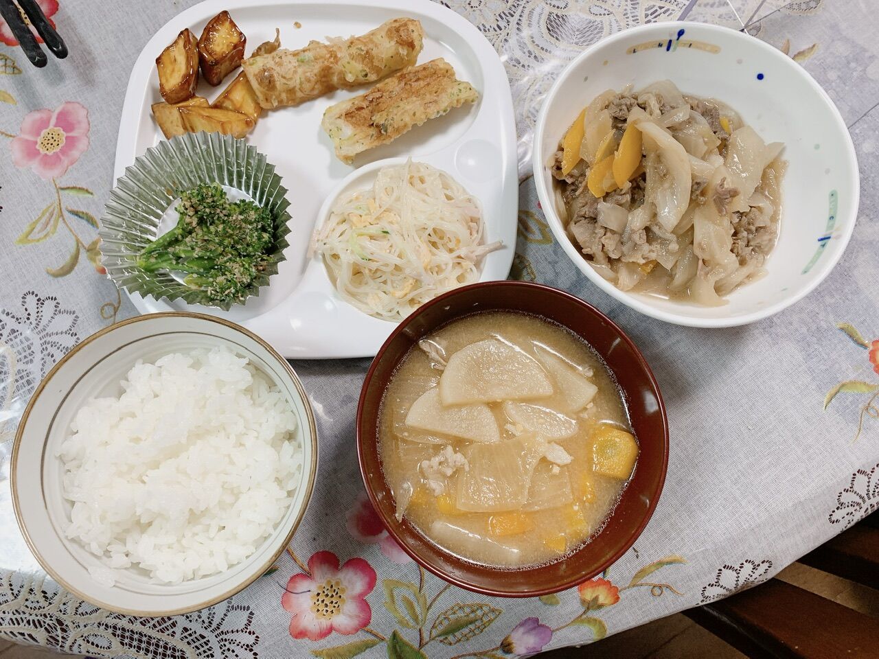牛肉と白菜の旨煮、豚汁、春雨サラダ、ブロッコリーのごまあえ