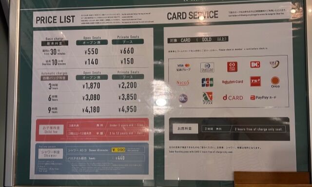 ゴールドカードを持っていれば2時間までは無料で、ソフトドリンクも無料