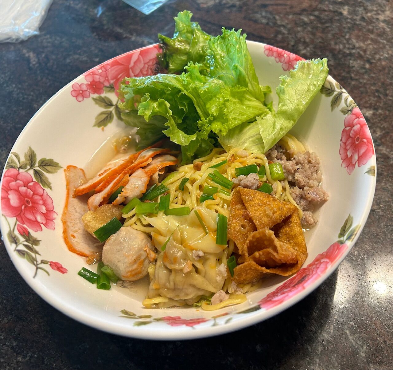 家に戻って丼に入れてみてびっくり。40バーツなのに、ムーデーン(チャーシュー)もたっぷり、ワンタンも2個、つみれが1個、豚ひき肉も少し入っていて具沢山。美味しかったし、人気があるのも納得。