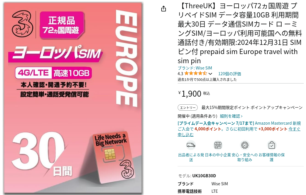 宿以外のネット接続は、日本でこのSIMカードをAmazonで買いました。