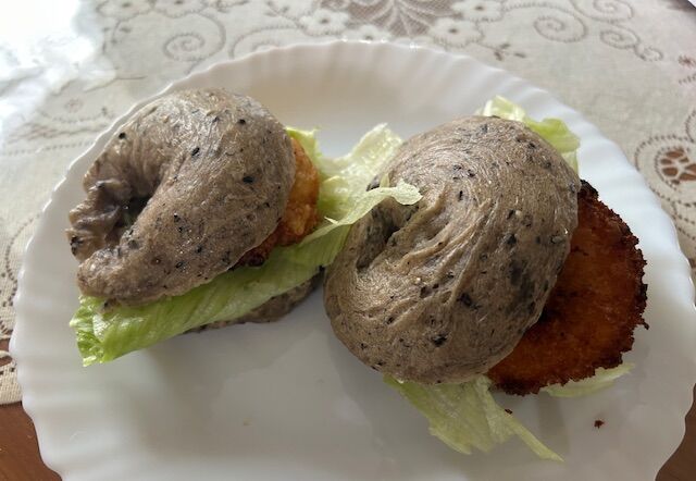 昼食は、子ども食堂の残り物でもらってきたエビフライと家にあったチーズ、レタスをはさんだベーグルサンドにしました。