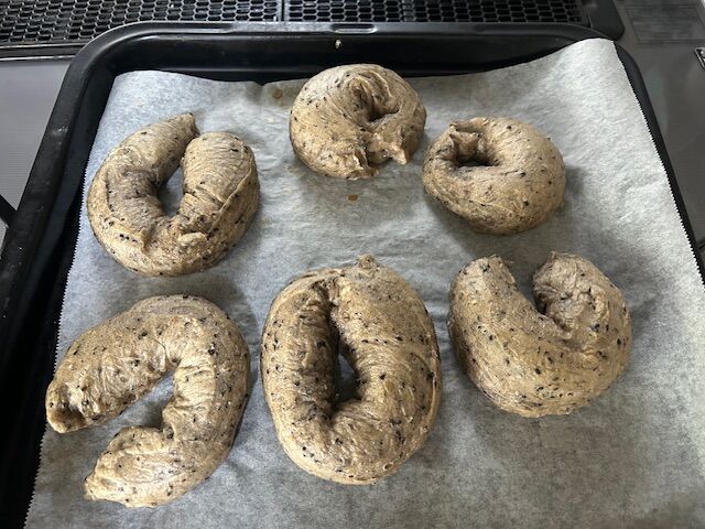 二次発酵まではパン焼き機がしてくれます。ひも状にしたものをドーナツの形にして、沸騰したお湯で1分間茹でます。それをオーブンで焼き上げます。