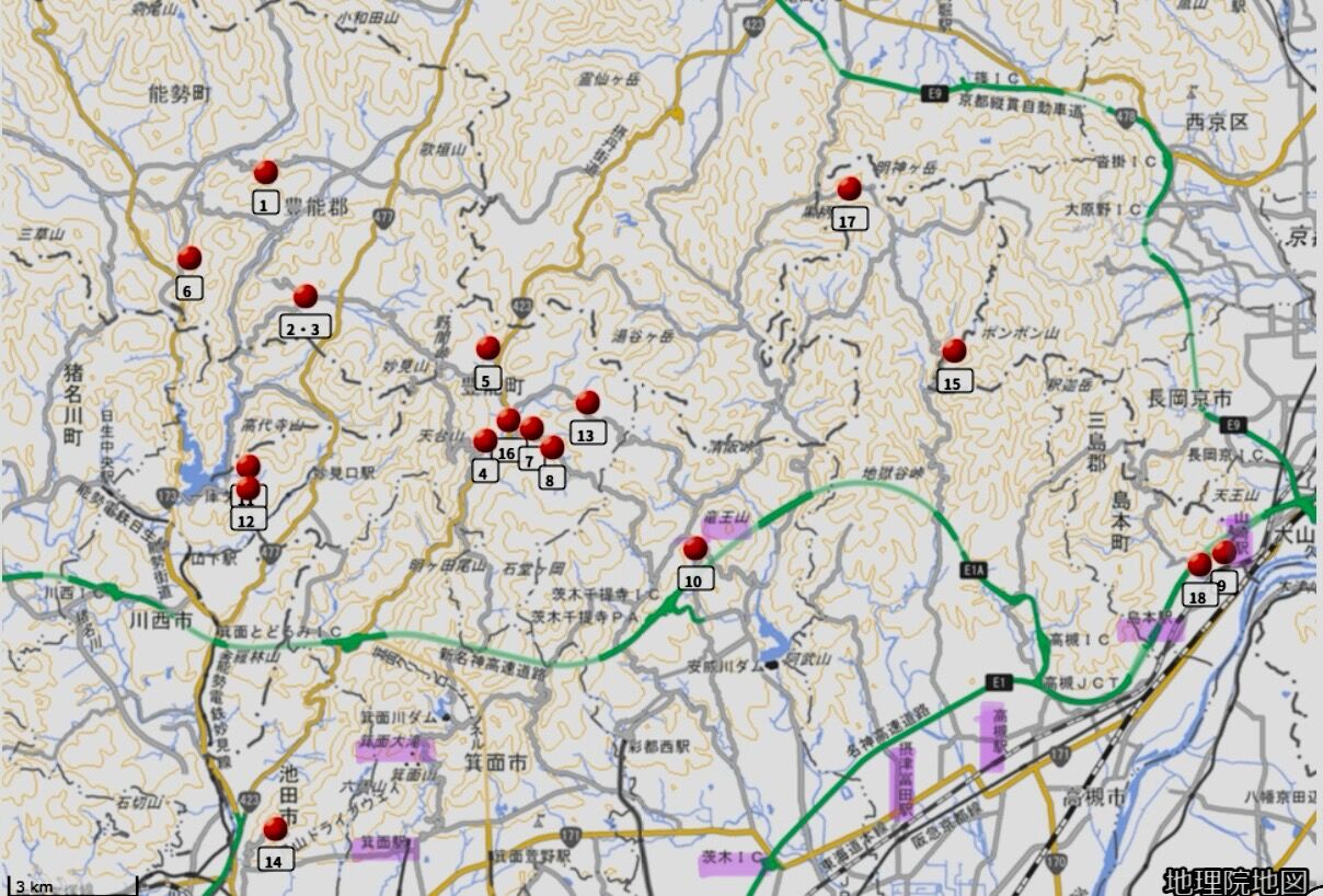 一番驚いたのは、左下の池田市の場所です。説明によると「9月19日6時15分頃、五月山の自然とのふれあいコース沿いの吊橋付近」と書いてあったのですが、この吊り橋があるハイキングコースは、多くの人が通る場所のようで、私も近くを車でドライブしたことが何度もあります。