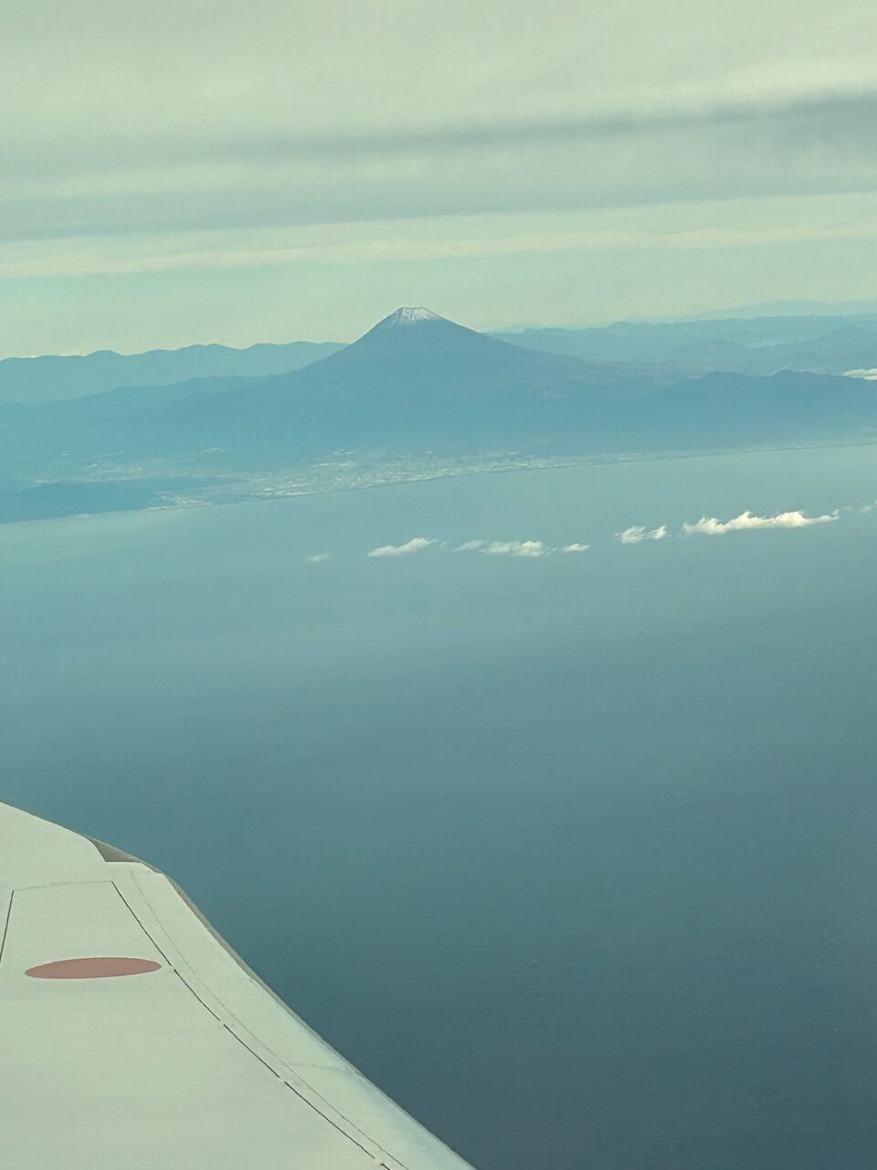 8時の便は搭乗が早めに案内され、定刻の少し前に離陸しました。昨日は4時間ほどしか寝ていなかったので、離陸も気づかず寝落ちしていました。でも機内放送の「左手に富士山が見えます」に気づいて、あわてて外を見ました。
