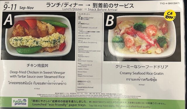 なんか「肉が食べたい」と思い、Aにしたのですが、写真を見て、Bの方に「CAオススメ」と書いてあるのに、今気づきました。ちょっと残念。