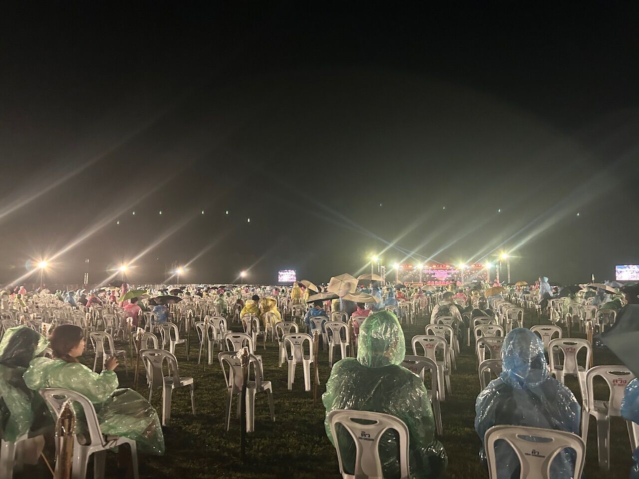 まずステージ上でコムローイの点火の仕方のデモンストレーションがありました。私たちの席からステージはほとんど見えないのですが、横に大きなスクリーンがあり、それを見ることができました。そして霧雨でも、そのコムローイは静かに揚がっていき、会場は大歓声!