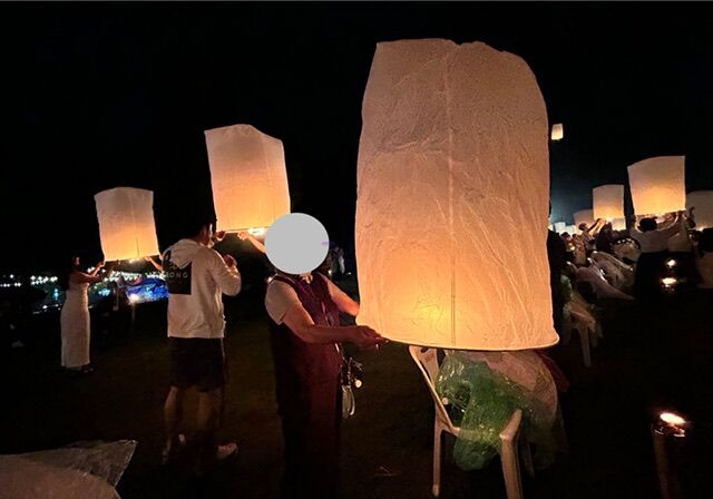 コムローイを揚げている間は、レインコートを着なくてもいいくらいの霧雨で、無事4個とも空に揚げることができました。風もなかったので、本当に静かに揚がっていくシーンは幻想的で目に焼き付いています。