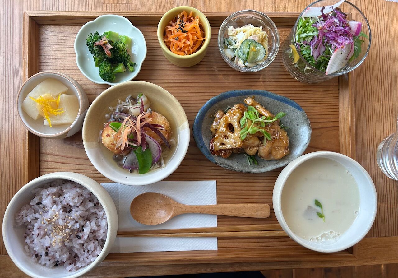 娘が駅まで車で迎えに来てくれて、まず琵琶湖大橋のたもとにある道の駅へ。そこで少し買い物をした後、そこからすぐ近くのカフェレストランへ。ここは娘が最近見つけた普通の一軒家を改装したような小さなレストランで、ご夫婦でされているところでした。