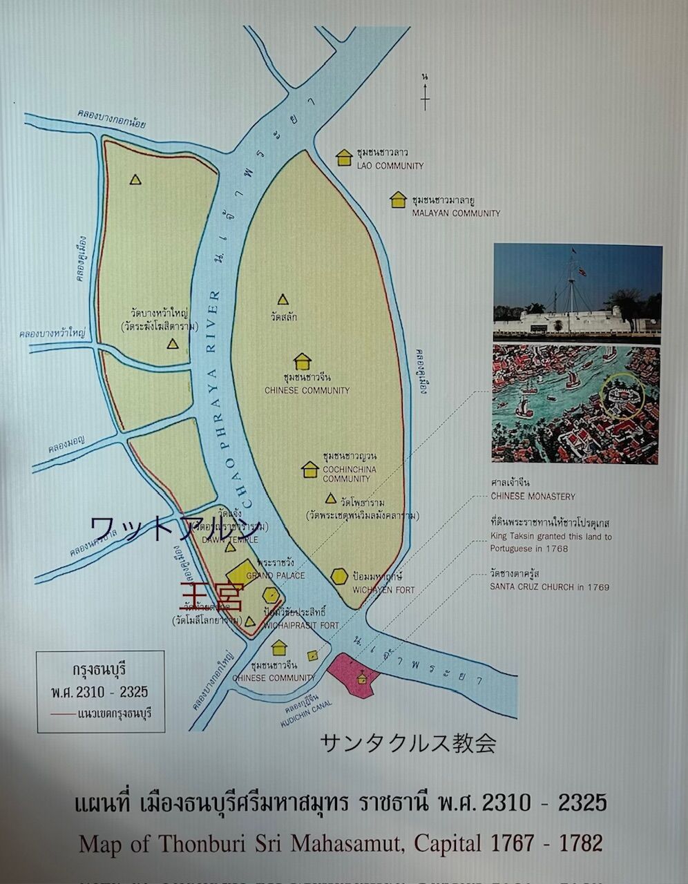 この下の地図は、1767年から1782年までのバンコクです。赤い部分がクディチンで、ポルトガル人の居住地です。ワットポーの東側には「COCHINCHINA」(これはフランス統治時代のベトナム南部のことだそうです)のコミュニティ、その上の東側は中国人コミュニティとあります。