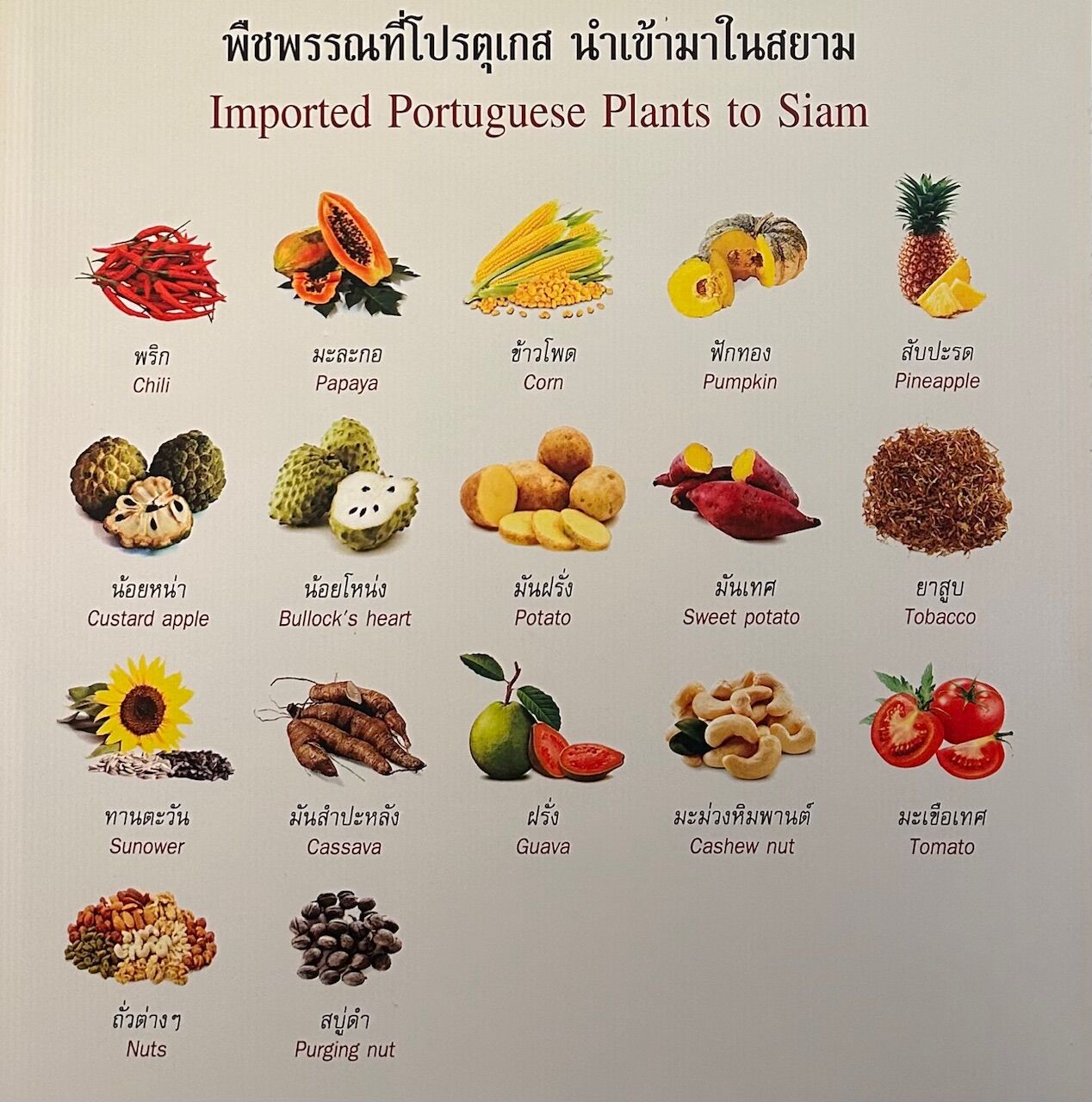 ポルトガルからタイへの輸入果物だそうですが、パパイヤ、パイナップル、釈迦頭(カスタードアップル)、グァバと言った、タイのポピュラーな果物まで入っていることに驚きました。それ以前のタイには、これらの果物はなかったということでしょうか。