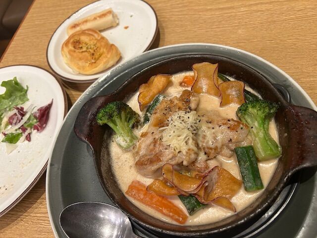 母が選んだのは、焼きたてパン食べ放題のベーカリーレストラン。写真にはふたつしか映っていませんが、すでに4個を半分ずつ食べているので、この段階で3個ずつ食べています。でもパン好きな母は、この後3つも食べました。