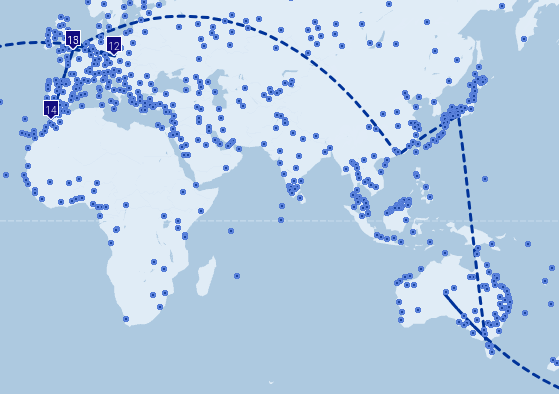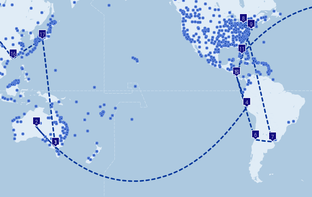 1大陸で4回飛ぶことができて、北アメリカ大陸のみ6回可能でした。上の地図はワンワールドのRound the Worldのページにあるプランナーで昔のルートを入力してみたものですが、イースター島に行く路線が出てきませんでした。でも今でもラタム航空という会社を使うことができるはずなんですが。ただ当時とはいろいろルールも変わっているかもしれません。