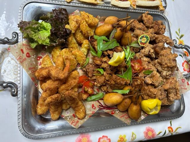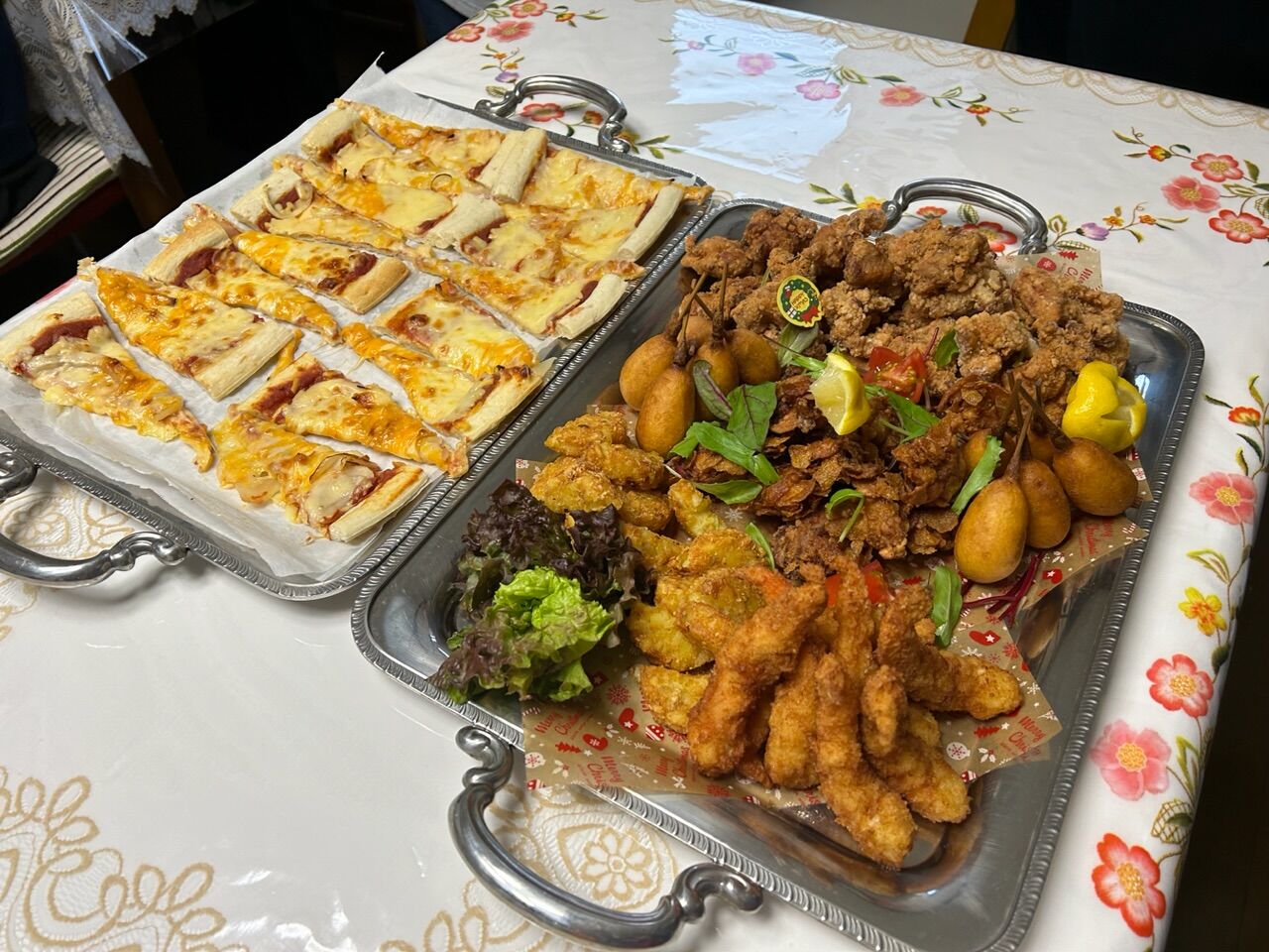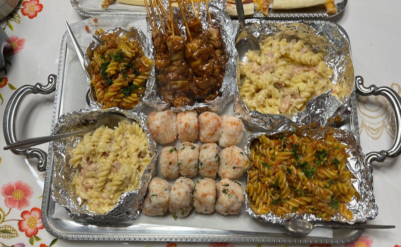この写真に載っているのが、大体半分の量。残りを大人たちが食べていたが、私達が食べきれない揚げ物は、子どもたちが全部食べてしまった。だから残ったのはペンネとピザが少しずつ。