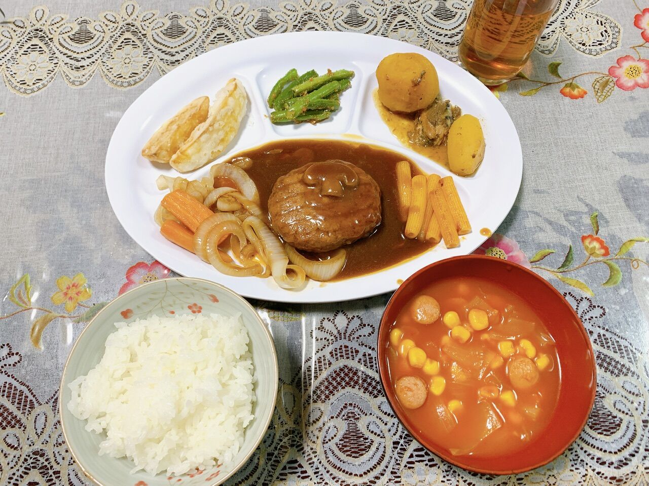ミニアメリカンドッグとハッシュドポテト(これは冷凍食品利用)