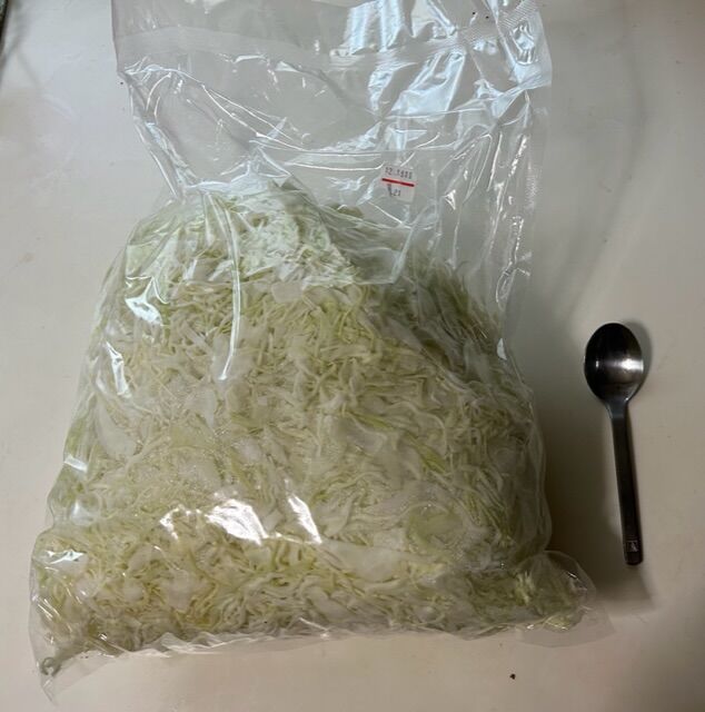 それよりも嬉しかったのは食材。もう年内1回しかないということで、使い切れないこのキャベツの千切りパック。自分でキャベツの千切りをこれだけ作ると時間がかかるだろうなあ。