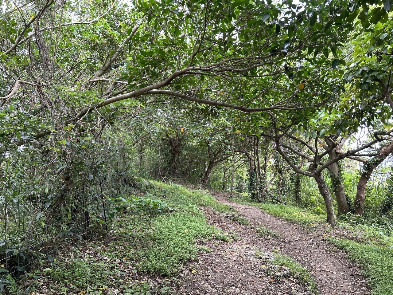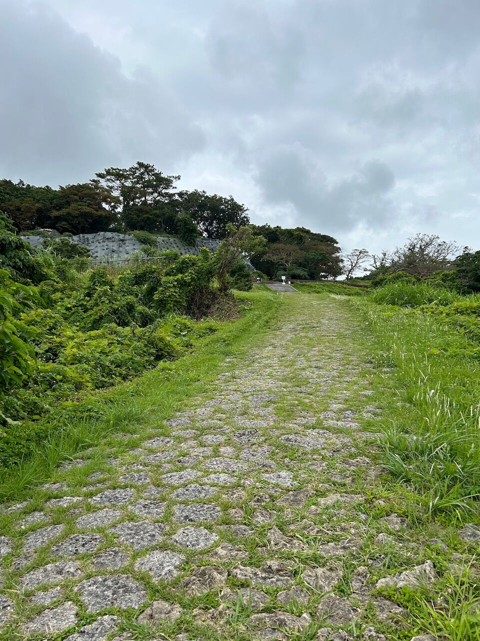 展示室の横に階段があり、そこを上がっていくと、沖縄ではよく見かける石畳の道に出た。実はここは小高い丘になっており、標高150m。だからこの坂も意外にきつい。
