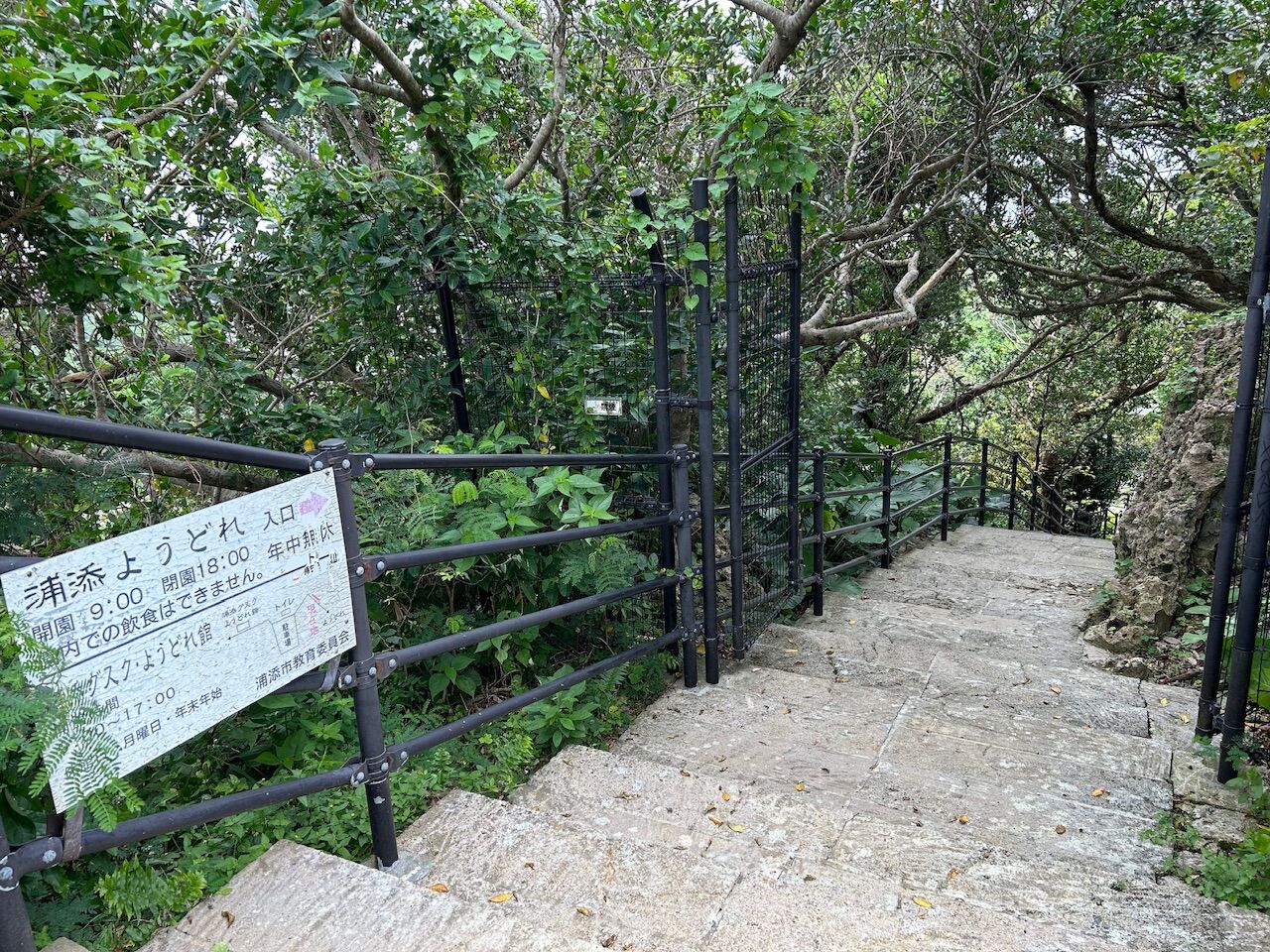 ゆいレールの「首里」から乗って7分、「浦添前田」駅で降り、やはり7分程度歩いて「浦添大公園南エントランス展示室」に着いた。無人だが、地図やパンフレットが置いてある。それによると、浦添大公園は、歴史学習ゾーンと憩いの広場ゾーンに分かれる大きな公園で、私が今日目指すのは、歴史ゾーンにある浦添グスクと浦添ようどれ。