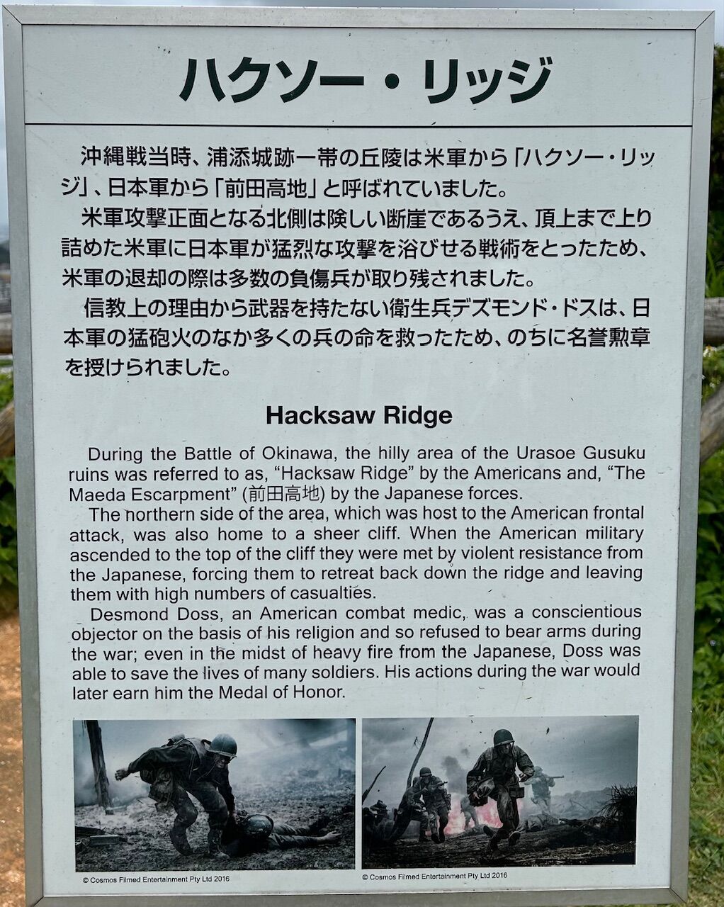 「ハクソー・リッジ」という映画の題名は聞いたことがあった。でも見る機会がなかったので、内容も全く知らない。このボードをみた時、それが沖縄戦を舞台にした映画ということを初めて知った。