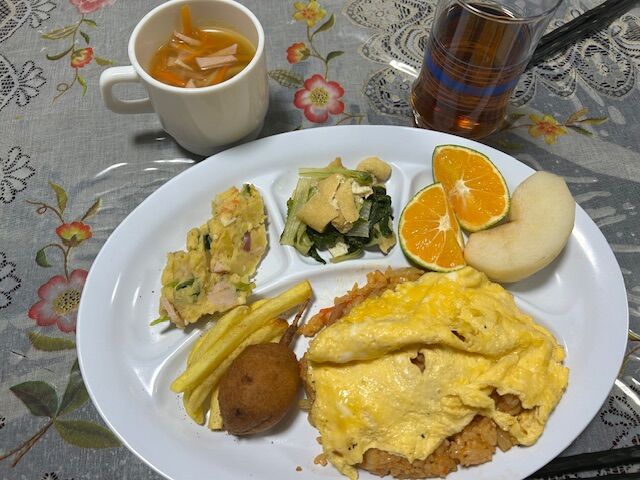 オムライス、ミニアメリカンドッグ、フライドポテト、ポテトサラダ