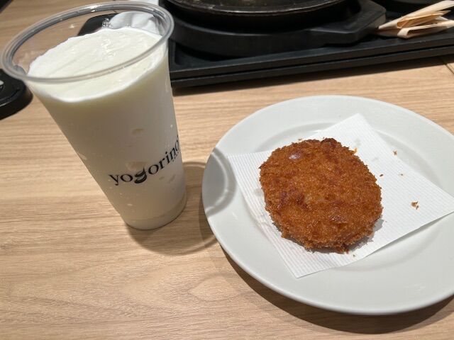 プライオリティパスのHPに載っている滞在時間は2時間。早く空港に来たので、限度一杯までいることにして、3,400円の限度までヨーグルトドリンクとコロッケを追加。でも税金分を忘れていたので、32円だけ支払った。